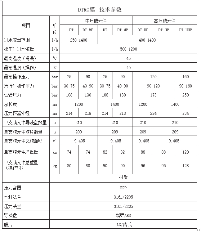 DTRO 组件操作压力具有 75bar,90bar,120bar,160bar, 四个等级可选,是目前工业化应用压力等级最高的膜组件,在一些浓缩倍数高的应用中,其含固量可以达到 20% 以上,浓缩倍数高。